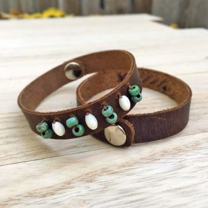 The perfect wrist piece to stack with your other favorites bracelets, these leather cuffs go with everything! Offered in 3 sizes, including custom, these are guaranteed to fit. Every cuff is proudly handcrafted by the artist in the USA on genuine saddle leather. Offered in a variety of stones, faceted sparkly Czech glass or even gold or silver beads. Leather Cuffs also available in Men’s sizes and styles.