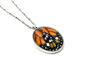 This unique pendant necklace is handcrafted using two REAL Monarch butterfly wings embedded under magnified glass! The butterfly wings are ethically sourced from eco-friendly butterfly farms and sanctuaries where their wings are collected after death and recycled into jewelry to raise awareness about the species. Butterfly Farming actually helps to preserve rainforests and also helps assure the survival of natural butterfly habitats. Necklace also available in Sterling Silver and 14K Gold filled chain options.