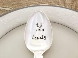 Vintage hand-stamped spoon that says “i (heart) u deerly” with antlers. It is a vintage silver plated spoon showing gentle past love and life. Your vintage pattern will vary but they’re all lovely and in good condition.
