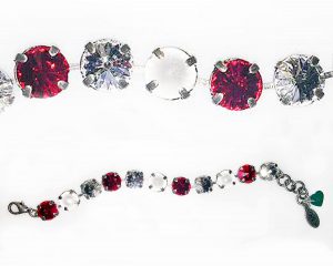 Handcrafted Swarovski Elements bracelet featuring 12mm crystals in Siam, Crystal and Matte, an antique silver setting & a hand-stamped charm. Our bracelets are completely customizable – any color combination, various charm additions and made to fit any wrist size.